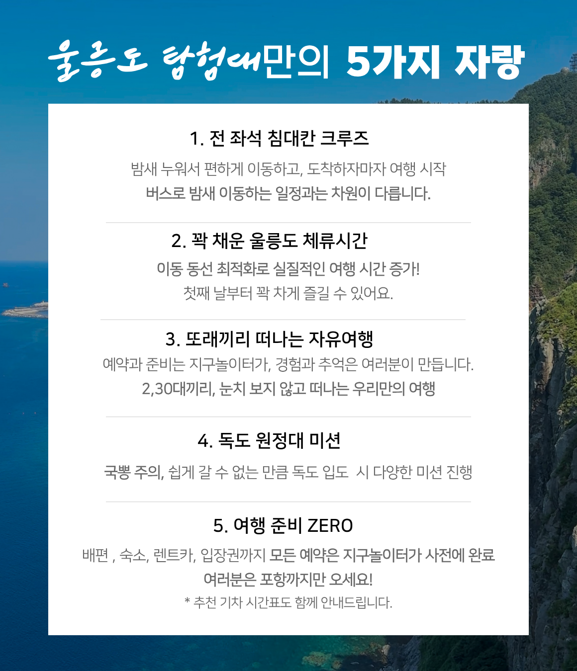 또한 지구놀이터가 이용 예정인 선박은 전 좌석이 침대칸으로 구성되어 있고, 밤 11시에 출발 → 오전 6시 도착 일정이라 한숨 푹 자고 일어나면 울릉도에 도착 해 있을거에요.